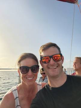Where were we? Oh yes, the sunset cruise. We enjoyed getting front row seats and chatted with the family behind us- a group of siblings that had met up in STX from around the entire US. The rum punch started flowing1, and as always once I start drinking, I start telling Scott all the reasons he should marry me. And as this always goes, he tells me all the reasons we shouldn’t get married. It was during this passionate “Request for Proposal phase of the evening” (that’s what Scott calls this) as we were standing along the boat’s railings looking out over the dramatic colorscape that the sunset offered up that evening, that the siblings we had met took the VERY BEST photographs of us that I have ever seen. We had no idea that they’d taken them and when we eventually sat back down they said “I hope you don’t mind but we wanted to snap some pictures of you guys because it looked like you were enjoying yourselves so much.” We thanked them profusely and assured them there was nothing weird at all about them having done so and they shared the photos with us. I am so thankful of their kind gesture because it captured candid snapshots of an incredible evening for us and the shots so perfectly capture and sum up our relationship.