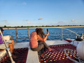We chatted with the crew some, learning how they came to be in STX and the captain and first mate of the Jolly Mon. I needed to take a trip down to the “head.” The entire time I was down there I was remembering the instructions we had received in our briefing and was reciting them in my head chant-like as a reminder as well as seeing them reiterated artistically in needlepoint on a sign directly across from me: “If it wasn’t in your body, it doesn’t belong in our potty.” I had the best intentions of putting the toilet paper in the trash can next to the loo, I really did, and then just out of sheer muscle memory and habit, I promptly dropped it into the bowl. Instantly discovering the error of my ways, I panicked and in a split second decision, decided that maybe the same 3-second rule that applies to dropped food on the floor also applies to dropped T.P. into the water and snatched the just dropped wad of T.P. out of the potty. It must have been marine T.P. because it was already starting to disintegrate, but I gamely fisted what I could and threw it away in the correct spot, assuring myself that my bravery saved the ship from certain doom. And then I spent the next five minutes washing my hands.