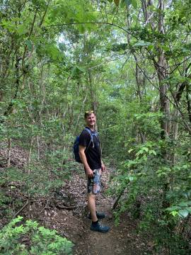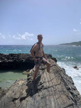 The hike was hot and steep but the views of the Caribbean that we were teased with along the way when the trees would thin enough for us to catch sight of it made us push on. When we finally arrived at the rocky shoreline we were rewarded with stunning views; the mountains rose up around us, the turquoise water before us, and the sound of the surf moving the rocks around as the waves crashed against the shore all around us. We saw some people crawling over rocks a few hundred meters away and figured that was the way to the pools. When we got to the group, they indicated that we were on the right track and we climbed up the rock face and over the giant boulders to reach the first pool.