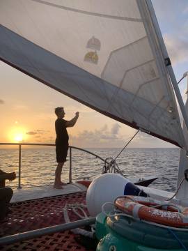 We arrived at the Fredriksted pier early and killed time by sitting in the shade and reading until it was time to board. We were given the standard catamaran trip briefing but also a little history on the 63 foot vessel we would be sailing on. Though she now sports the name The Jolly Mon, the boat has a storied past and used to be named Che Cje. In her previous life she was the fastest catamaran of the 1970’s, setting several transatlantic racing records. She was then purchased by an enterprising businessman drug czar who took advantage of her sleek engineering and speed and used her for drug running in south Florida throughout the Don Johnson/Hawaiian shirt/Miami Vice era until being intercepted by the US government in the 90’s. She was auctioned off and now in her golden years, finds herself giving leisurely sails through the Frederiksted harbor several times a week to tourists, set to the gentle beats of live easy-listening Reggae, never having to look nervously over her shoulder to see if the Coast Guard or DEA are in hot pursuit.