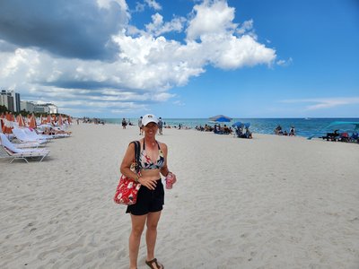 Next we headed to the famous South Beach in Miami Beach. Scott was patient and found us a parking spot in a crowded public lot right at the beach and we walked the short distance to the beach. The beach was crowded since it was a Sunday but we claimed a little spot to put our stuff down and waded into the water. The water temperature was reminiscent of a bathtub but it still felt good and we floated around for a little and enjoyed people watching. Scott eventually got out to go lie on the sand and bask in the sun and I opted to stay in the water. A few minutes later storm clouds rolled in, the temperature dropped, and rumbles of thunder could be heard. Not long after that the first few fat raindrops started to fall. This was our cue to pack it up and head back to the car along with every other beachgoer.