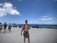 Next we headed to the famous South Beach in Miami Beach. Scott was patient and found us a parking spot in a crowded public lot right at the beach and we walked the short distance to the beach. The beach was crowded since it was a Sunday but we claimed a little spot to put our stuff down and waded into the water. The water temperature was reminiscent of a bathtub but it still felt good and we floated around for a little and enjoyed people watching. Scott eventually got out to go lie on the sand and bask in the sun and I opted to stay in the water. A few minutes later storm clouds rolled in, the temperature dropped, and rumbles of thunder could be heard. Not long after that the first few fat raindrops started to fall. This was our cue to pack it up and head back to the car along with every other beachgoer.