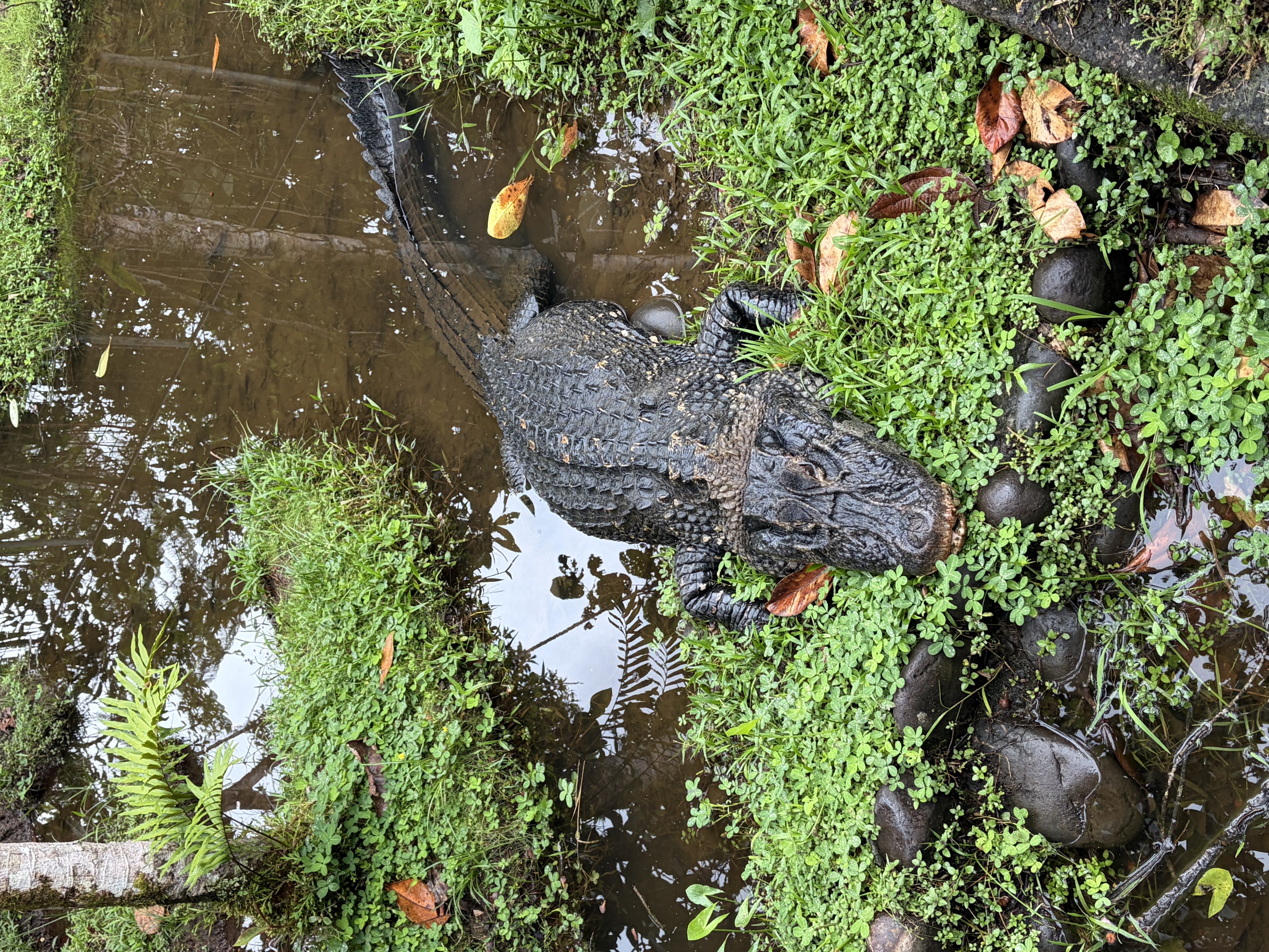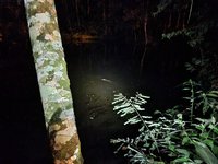 The night hike consisted of a walk around the grounds looking for some of the nocturnal Amazonian species. Scott said they encountered leaf cutter ants, and then when they got to a pond and shined their flashlight out over the water, saw a dozen pairs of eyes reflecting back at them… eyes that belonged to caimans!
