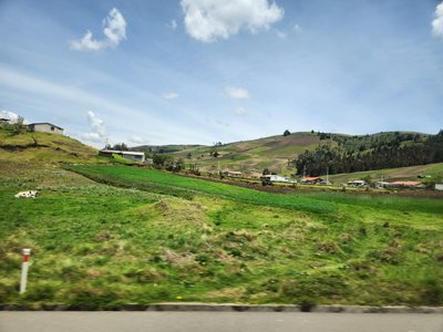 The drive out of Baños was impressive. The bus had to make a slow and steady climb up over the Andes and many times it seemed like we were in the clouds. At one point, as we made our descent into the town of Alausi (home of the Devil’s Nose train ride), a road sign announced a 12% grade and I was thankful for the apparently healthy brakes on our bus and I could hear the engine exhaust braking system working hard to slow us as well. (For comparison, the Saluda Grade that I-26 climbs between SC and NC is 7%.) It was enjoyable watching the scenery of the subtropical highlands out the window and it was amazing to see the patchwork farmland clinging to impossibly steep mountain faces. Humans are both tenacious and ingenuitive and across the globe are able to cultivate crops surprisingly well in seemingly improbable places. (At one point, Scott quipped, “and we can’t even grow a freaking tomato!”)