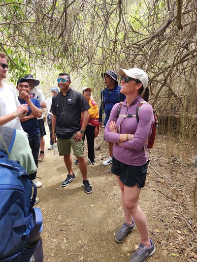 This was the dry season and it was quite arid and much hotter than the mainland. Everything on the desert island was crunchy and a drab brown this time of year. The steep incline was often punctuated by stairs and blessedly, our guide would stop occasionally to show us an interesting plant or to listen for a particular bird and these nature talks served as welcome breaks to catch our breath and to cool off.