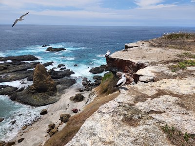 We were given some options for our hiking choices. We chose the longer one and followed our guide to the cliffs on the west side of the island. Everywhere we looked we saw blue footed boobies. The birds nest on the ground and we must have seen hundreds, if not thousands, of nests right off the footpaths that we were on. As we walked to the cliffs, the guide told us interesting tidbits about them, such as how to determine their age (the brighter and more intensely blue their feet, the younger they are) and gender (the males’ irises are more intensely yellow, and the females pupils are larger, and the females are generally larger in overall body size). I soaked all this up, stored it away, and am ready to call upon it when I am playing trivia at a later date.