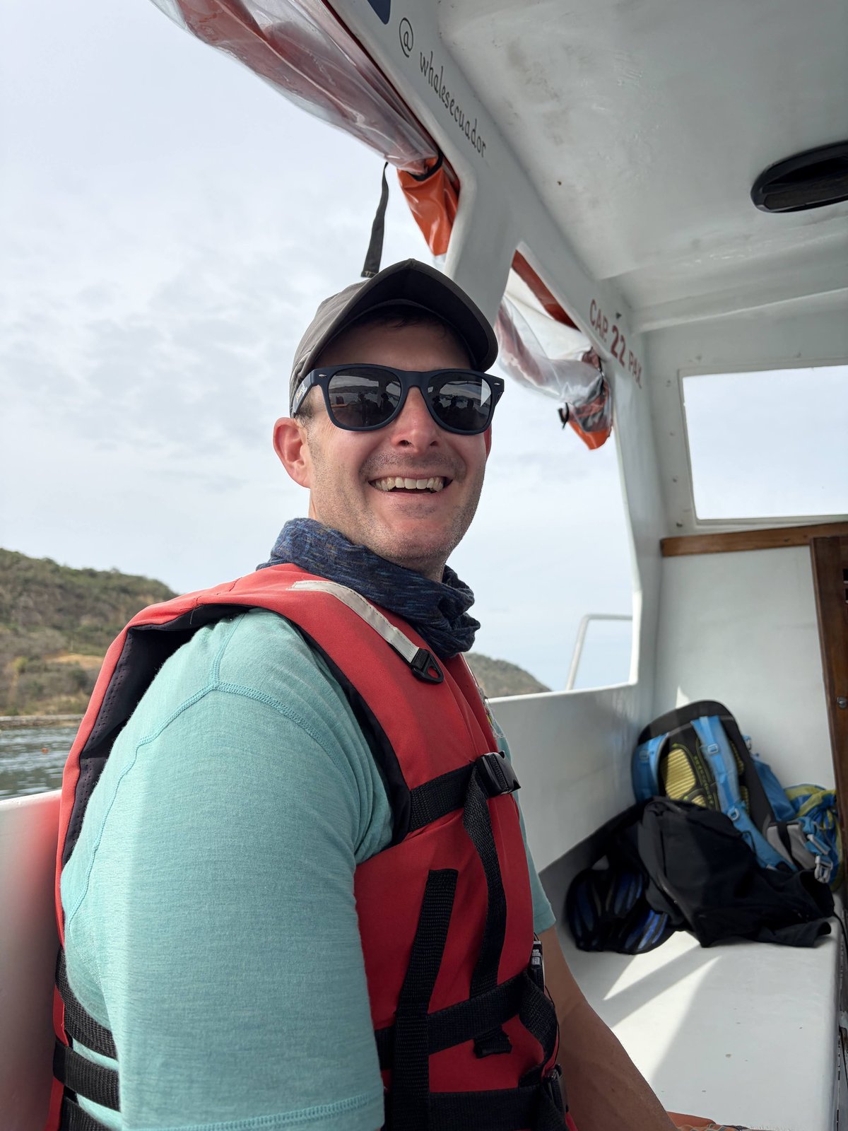 Scott had booked our tour and on Sunday morning after breakfast we walked into Puerto Lopez to the tour company’s storefront as instructed. From there our group followed the guide down to the same pier that Scott had left from the day before on his dive trip. While waiting for the boat to arrive we chatted with some of the other tour-goers and met a pair of young Dutch engineers who were assigned to a sea-salt extraction project a few hours south of Puerto Lopez. We quickly learned that they had their very own security detail assigned to them, a pair of late 20’s dark sunglass-clad Ecuadorians who must have been packing the heat in the tactical fanny packs that were sporting, and we felt quite safe to be on the same trip- we couldn’t imagine these fellas letting any cartel funny business go down around us on their watch.