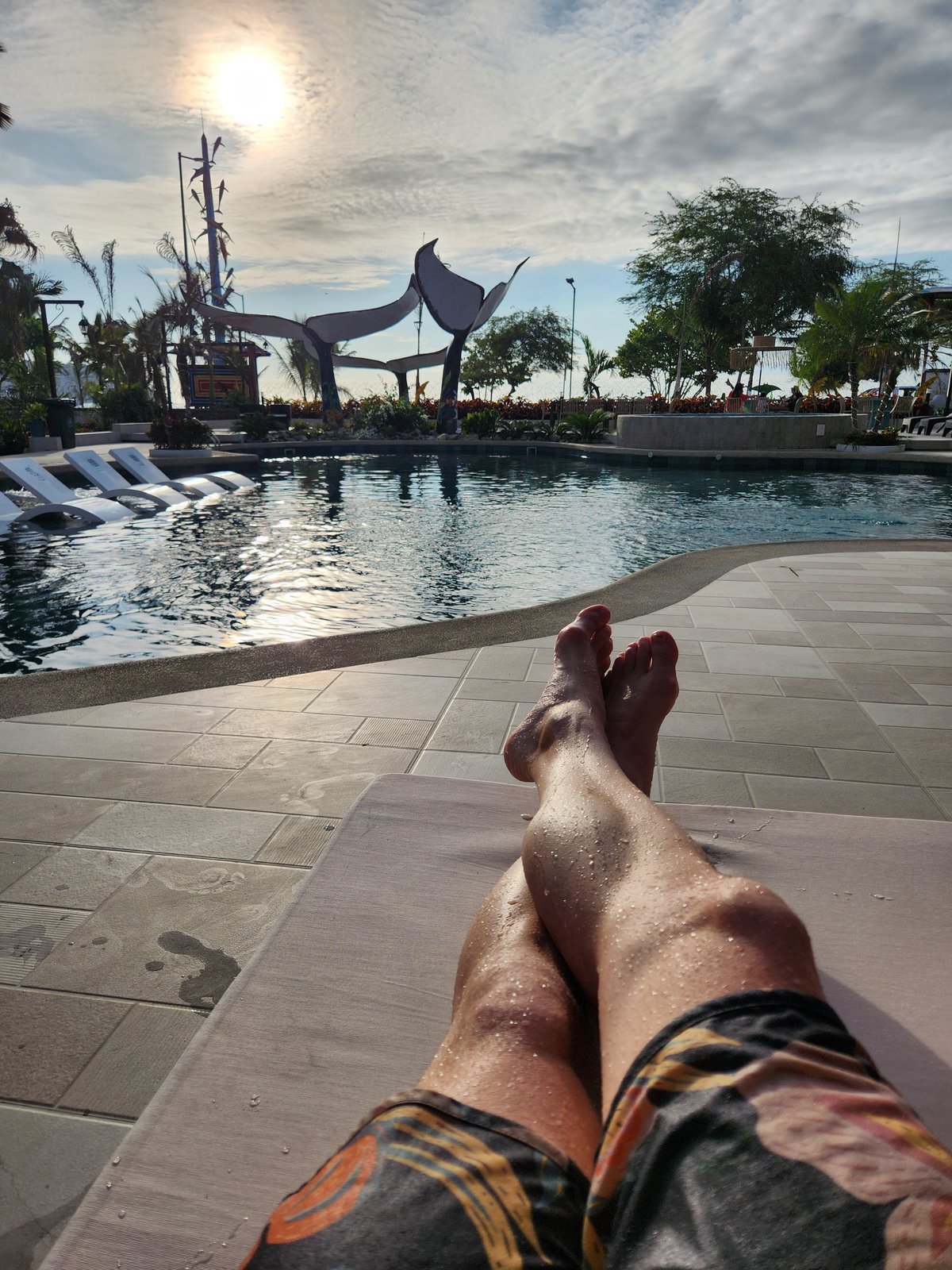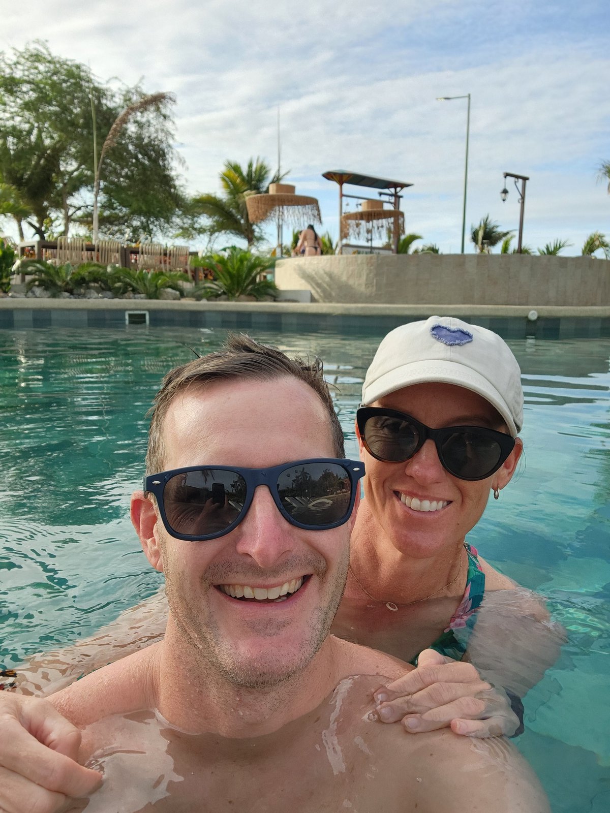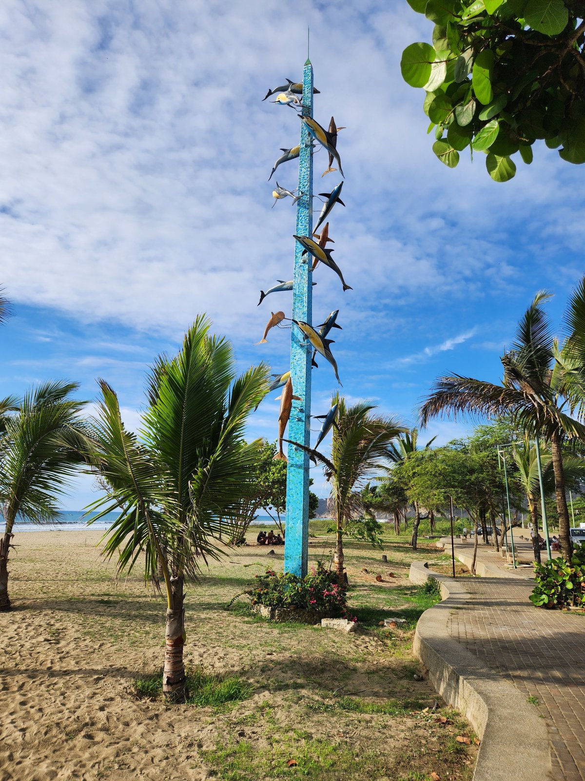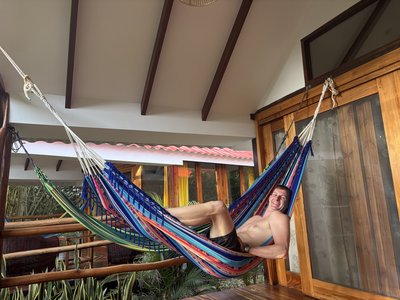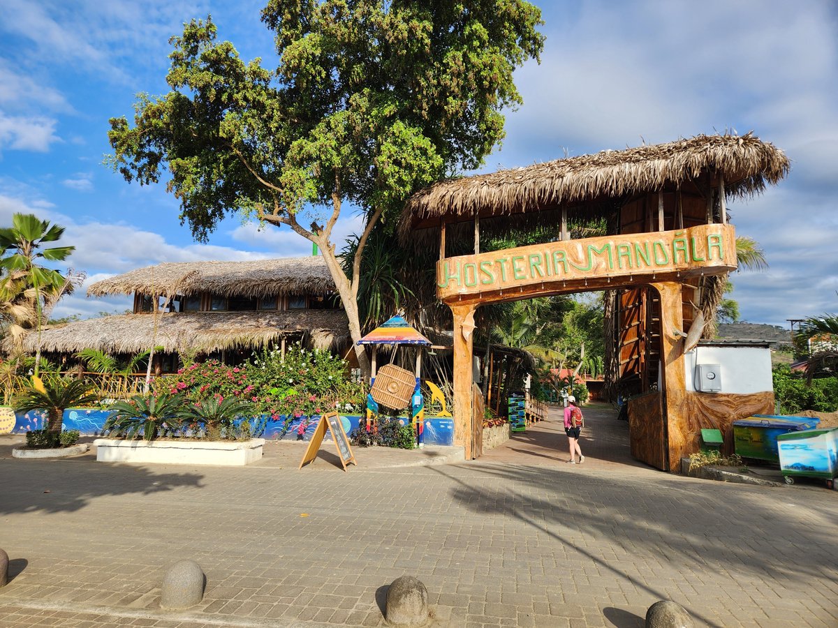 Once back in Puerto Lopez we said goodbye to our Dutch engineer friends and their security entourage and wandered through town and stopped at some of the local street vendors’ carts for a coco frio (a chilled coconut with its top cut off and a straw inserted inside so you can drink the coconut water) and fresh mango. Eventually we made it back to the Hosteria Mandala and decided to take a dip in the pool and then relax in the hammocks hanging on the Pulpo’s front porch before cleaning up for dinner.