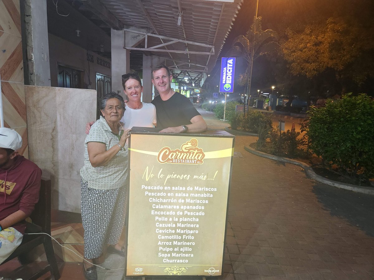 Before strolling back into town we caught the sunset from the beach outside our hotel. We had enjoyed our first visit to Carmita’s so much that we decided to visit there again for tonight’s dinner. We had another lovely meal and chatted with Carmita herself via Google translate and poorly mangled Spanglish on our part. She seemed to enjoy telling us that her restaurant had been around for 45 years and was the first in Puerto Lopez and she happily obliged when we asked her to pose for a picture with us outside the restaurant. Carmita was yet another friendly Ecuadorian that went out of her way to make our trip extra special.