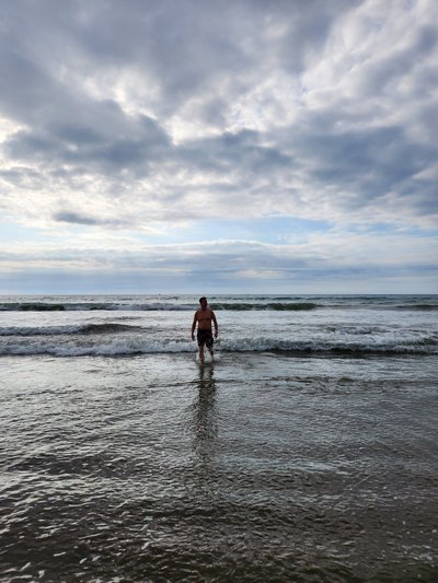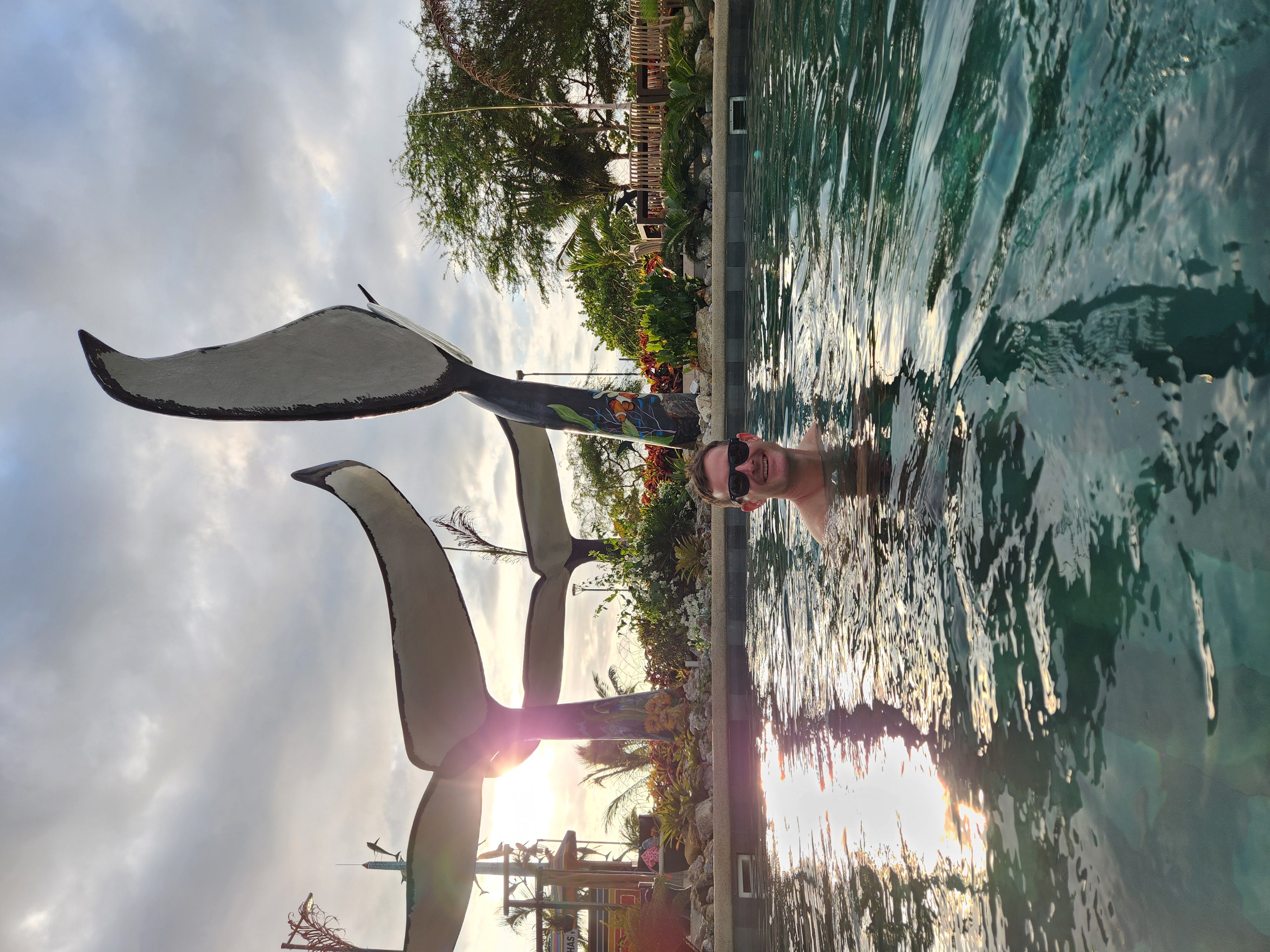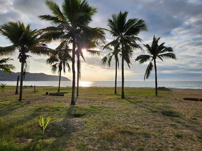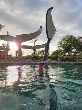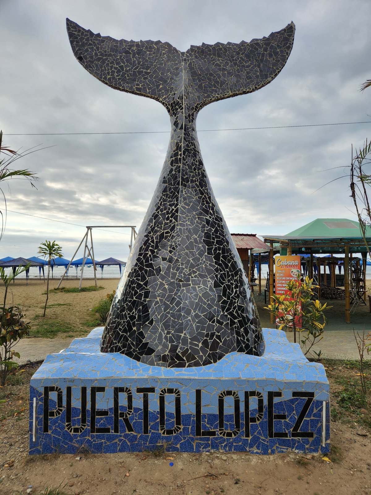 We changed into our bathing suits and headed down to investigate the beach. This stretch of shoreline that this part of Puerto Lopez and our hotel sat on reminded me of Koh Lanta in Thailand, with the curve of the shore and the mountains book-ending each side of the cove. We walked for a bit and enjoyed seeing the various humpback whale sculptures, placards, and displays- Puerto Lopez is located in the ideal spot for watching them during their migration season (June to October) and the area serves as a nursery for them where they come to birth their calves. Unfortunately we were out of this season so there would be no whale watching for us.