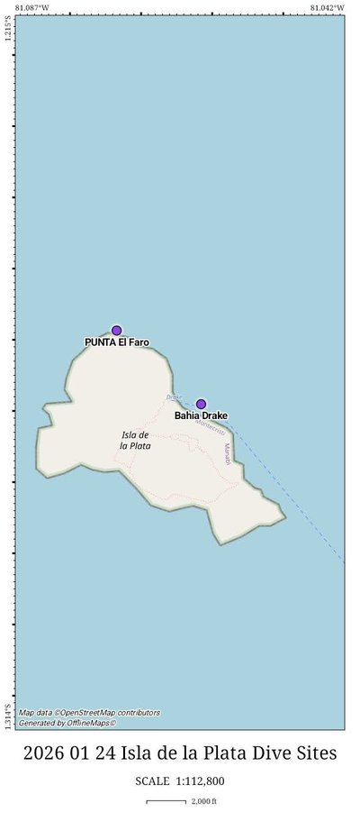 Their first site was Punta el Faro and it was 38 minutes long at a max depth of 63 feet. When they surfaced, and were headed to their next dive, at Bahia Drake, Scott had to point out to the divemaster that they actually needed more surface interval time. He was trying to hurry them along so that they wouldn’t be late to collect the hikers… Puerto Lopez’s tourist activity had come screeching to a halt a few weeks prior because of the cartel violence around the holidays, and this blended trip was an attempt to get it back up and going again but added an insane amount of complexity to the whole day. Luckily he heeded Scott’s advice and when they had waited a safe amount of time, had a lovely dive at Bahia Drake that lasted 55 minutes at a max depth of 27 feet.